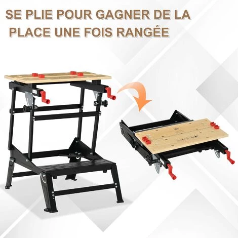 Cet établi table de bricolage pliable est l’équipement indispensable pour tout adepte du bricolage ! Conçu et fabriqué en bambou (mâchoires) avec châssis robuste en acier, cet établi-étau répondra à toutes vos attentes et deviendra rapidement indispensable pour toute opération de bricolage : sciage, montage, vissage, ponçage, etc… Caracteristiques : – Établi-étau table de bricolage indispensable pour toute opération de bricolage : sciage, montage, vissage, ponçage, etc… – Établi pliable en 2 temps 3 mouvements : idéal pour le ranger et transporter très facilement sans encombrement – Porte-outils intégré, règle et rapporteur imprimés sur la table pour gagner en rapidité et efficacité – Conception, fabrication de qualité : mâchoires bambou et cadre en acier robuste (charge max. reco. de 100 Kg), usage pérenne – Triple hauteur de travail, usages variés : établi, étau, chevalet de sciage, etc… – 4 cales ajustables et mâchoires avec rainures : serrages variés, excellente tenue des matériaux – Serrage à une main permet d’ajuster les mâchoires ensemble ou indépendamment – Mâchoire avant à bascule (pour serrage vertical si besoin en cas de pièce de forme irrégulière) – Pieds avec revêtement caoutchouc antidérapant – Facile à assembler grâce à une notice de montage illustrée fournie Spécifications : – Couleur : noir, bambou – Materiaux principaux : acier, bambou – Dim. totales : 68L x 60l x 21-78H cm – Dim. pliées : 89L x 60,5l x 20H cm – Hauteur réglable : 21-78 cm – Dim. mâchoires : 60,5L x 15l cm – Ecartement mâchoires : 0-10 cm – Charge max. recommandée : 100 Kg – Livraison effectuée en un colis – Réf. : B71-048