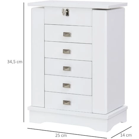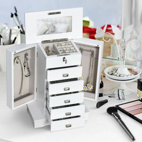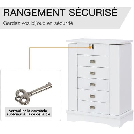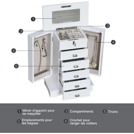 – Armoire Ă bijoux multi-rangement : 5 tiroirs coulissants, 2 compartiments latĂ©raux avec crochets pour colliers, rangement haut Ă bagues