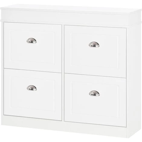 Ce joli meuble à chaussures trouvera facilement sa place dans votre entrée. Equipé de nombreux rangements, il vous permettra de ranger jusqu’à 32 paires environ suivant votre pointure. Ce meuble à chaussures à 4 abattants apportera beaucoup de charme à votre pièce avec ses poignées vintage en forme de coquilles pour une ambiance campagne. On aime son look épuré et moderne, facile à marier avec tous les styles de déco.