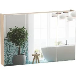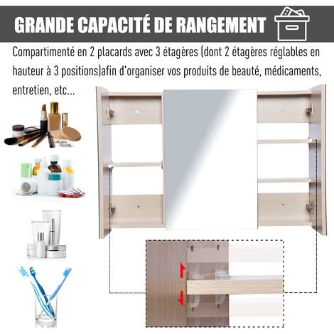 Description : Cette magnifique armoire miroir murale de salle de bain ajoutera une touche contemporaine d’élégance dans votre pièce d’eau. Elle vous permettra de vous regarder afin de vous maquiller, coiffer ou raser et vous offrira un grand espace de rangement. Quoi de plus pratique et esthétique ? Caractéristiques : – Armoire miroir murale polyvalente qui s’intégrera facilement à l’espace de votre choix : salle de bain, toilettes, dressing, etc… – Grande capacité de rangement compartimenté en 2 placards (3 portes) avec 3 étagères (dont 2 étagères réglables en hauteur à 3 positions) afin d’organiser vos produits de beauté, médicaments, accessoires, etc… – Système de fermeture de portes avec tampons de fermeture douce – Conception et fabrication en panneaux de particules robustes avec verre miroir frontal : usage pratique et durable – Installation facile (4 vis à expansion incluses pour la fixation au mur) à l’aide du manuel d’assemblage illustré fourni Spécifications : – Couleur principale : chêne clair – Matériaux principaux : panneaux de particule et verre – Dim. totales : 90L x 14l x 60H cm – Largeur placard gauche : 23 cm – Largeur placard droite : 63 cm – Epaisseur verre miroir : 0,3 cm – Epaisseur panneaux : 1,5 cm – Charge max. recommandée : 15 Kg – Livraison effectuée en un colis – Réf. : 834-163