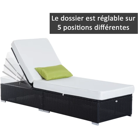Description : Avec ce lit bain de soleil, vous pouvez profiter en toute quiétude du soleil dans le jardin, sur la terrasse ou au bord de la piscine ! La résine tressée, design et douce au toucher est imperméable et facile à nettoyer pour passer de longues heures à dorer au soleil ! Caractéristiques : – Bain de soleil grand confort avec matelas épaisseur 10 cm – Matelas de haute qualité en polyester 180G, avec rembourrage souple (densité 23D) – Matelas déhoussable afin de vous en faciliter son entretien – Dossier inclinable multi-positions afin de satisfaire tous vos besoins et envies : sieste, lecture, bain de soleil, etc… – Armature en aluminium robuste et inoxydable pour un usage pérenne tout confort toute sécurité – Revêtement en résine tressée imitation rotin : matériau imperméable et résistant aux rayons UV et à l’humidité – 6 pieds imitation aluminium avec patins antidérapants : raffinement supplémentaire – Coussin décoratif vert offert ! Spécifications : – Couleurs principales : noir, crème et vert – Matériaux principaux : aluminium, résine tressée imitation rotin, polyester, mousse de rembourrage – Dimensions totales : 195L x 68l x 31H cm – Matelas épaisseur 10 cm – 1 coussin offert – Livraison effectuée en un colis – Réf. : 01-0815