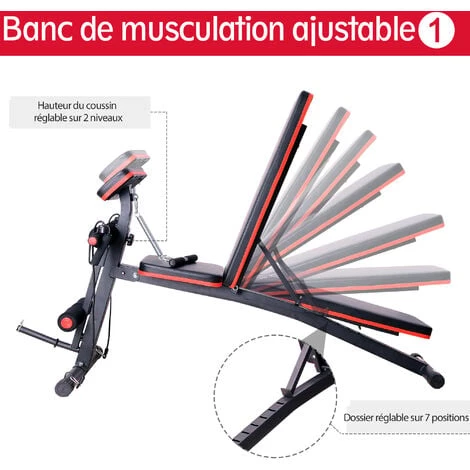 Ce banc à haltères est l’équipement adéquat pour pratiquer des exercices de musculation chez soi. Débutants ou professionnels, vous pouvez travailler vos abdominaux, fessiers, jambes… en toute sécurité. Cet appareil de musculation est équipé d’une assise et dossier avec rembourrage en mousse haute densité pour plus de confort. Ce modèle pliable reste très pratique et se range facilement. Caractéristiques : – Banc de musculation complet idéal pour travailler abdominaux, médians, inférieurs, bas du dos, biceps, triceps et vos épaules – Appareil de Fitness pliable pour un gain de place en cas de non utilisation – Assise et dossier rembourrés avec une mousse haute densité très confortable et revêtement revêtement synthétique pour un entretien facile – Hauteur du coussin central réglable sur 2 niveaux et dossier ajustable (7 niveaux) – Structure robuste en acier renforcé et pieds antidérapants assurant stabilité et sécurité optimales – 2 sangles élastique + support haltères fournis – Grande capacité de charge (120 Kg) – À utiliser à domicile, dans un club ou dans une salle de sport : débutant ou confirmé, cet appareil de fitness convient aux sportifs de tout niveau – Montage et utilisation facile à l’aide du manuel d’assemblage et d’usage fourni Spécifications : – Couleurs : noir et rouge – Matériaux principaux : acier, ABS et EVA – Dim. totales : L 53 x l 160 x H 106 cm – Dim. pliées : L 54 x l 42 x H 150 cm – Dim. coussin d’assise : 30,5L x 30l cm (épaisseur : 4 cm) – Dim. coussin lombaire : 75L x 30l cm (épaisseur : 4 cm) – Dim. coussin accoudoirs : 29,5L x 14l cm (épaisseur : 4 cm) – Hauteur réglable coussin accoudoirs : 78-82 cm – Hauteur réglable dossier : 36-106 cm – Angle réglable minimum dossier : 100 ° – Accessoires fournis : 2 sangles élastiques – Charge max. recommandée : 120 Kg – Livraison effectuée en un colis – Réf. : A91-062