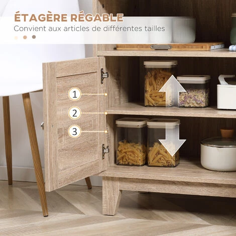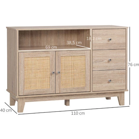 Ce joli buffet au style bohème multi-rangement équipé d’un placard double porte avec étagère réglable en hauteur, de 3 tiroirs coulissants et d’une niche vous permettra de ranger de la vaisselle, des couverts, du linge de maison et bien d’autres encore. L’aspect bois de chêne clair naturel et les façades façon cannage donnera du charme à votre espace intérieur.