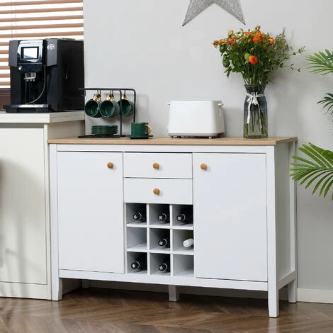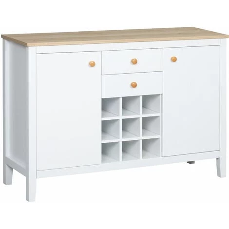 Cet élégant buffet de salle à manger HOMCOM se compose d’un grand plan de travail, de 2 tiroirs, de 2 armoires avec des étagères intérieures réglables et d’un porte-bouteilles avec 9 compartiments individuels. Les étagères intérieures sont réglables en différentes positions pour s’adapter à la taille des objets. Il est idéal pour ranger vos ustensiles de cuisine tels que les couverts, les aliments, les tasses, entre autres.