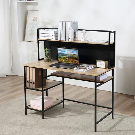 – Bureau informatique design industriel mélant avec élégance châssis métal noir et plateau, étagères aspect chêne clair avec veinage