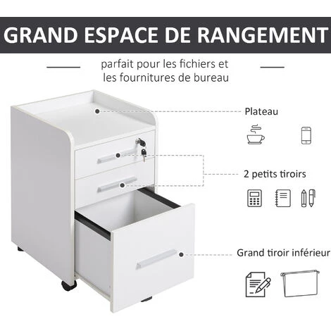 Vous en avez assez que vos document soient toujours en désordre sur votre bureau ? Ce caisson de bureau résoudra tous vos problèmes. 3 tiroirs vous offrent un grand espace de stockage pour vous permettre de mettre une imprimante, de ranger des documents et autres fournitures de bureau. 5 roulettes pivotantes permettent de le déplacer facilement. Ce caisson est vraiment un choix idéal pour ranger votre bureau.