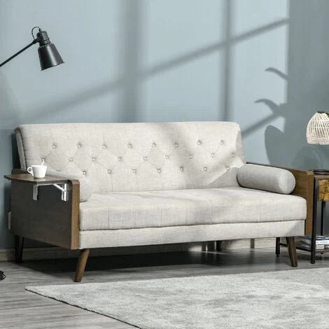 Laissez-vous séduire par le charme zen et cosy de ce superbe canapé convertible 3 places design scandinave bicolore beige aspect bois d’eucalyptus fumé. Son garnissage mousse haute densité, son revêtement en tissu aspect lin (55% coton, 45% polyester) et son piètement en bois d’eucalyptus avec patins antidérapants vous offriront le plus grand confort. Sans oublier son dossier inclinable à 3 positions, sa tablette rabattable et ses 2 coussins inclus qui vous permettront de profiter de bons moments de repos !