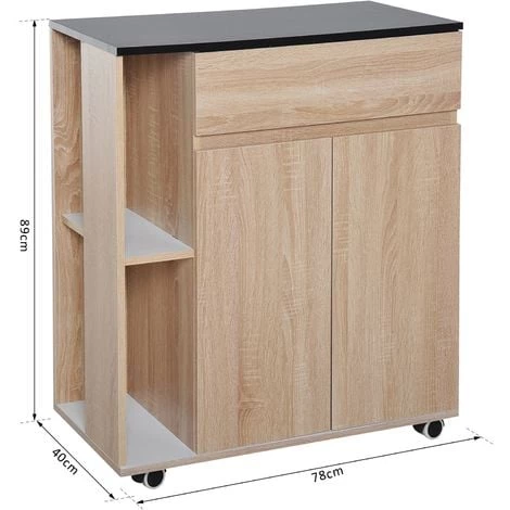 Ce chariot desserte muni de nombreux espaces de rangement vous sera d’une grande utilité. Vos ustensiles et autres accessoires de cuisine seront groupés en un seul endroit pour plus de praticité. Son design élégant bicolore chêne et noir apporte une touche de modernité à la cuisine. Le déplacement est facilité par les 4 roulettes, dont 2 équipées de frein.