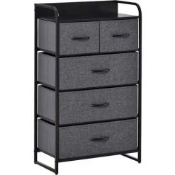 Cette commode de rangement en tissu, métal et MDF à 5 tiroirs offre un grand espace de rangement. Elle s’adapte très bien dans n’importe quelle pièce de la maison, apportant ainsi un espace de stockage supplémentaire. 5 tiroirs coulissants de 2 tailles différentes offrent un espace varié pour les accessoires et les petits articles, parfaits pour ranger les vêtements, les draps, les chaussures afin de réduire l’encombrement. Les tiroirs de la commode peuvent être repliés lorsqu’ils ne sont pas utilisés et elle dispose d’une conception anti-basculement pour plus de sécurité Caractéristiques : – Cette commode est équipée de 5 tiroirs pour offrir un grand espace de rangement – Parfait pour la chambre à coucher, la buanderie, le salon, l’entrée, etc – Les tiroirs de rangement peuvent être pliés lorsqu’ils ne sont pas utilisés – La structure en métal et le plateau en MDF durable offrent une résistance et une stabilité – La conception anti-basculement contribue à maintenir la stabilité pour plus de sécurité – Pieds réglables pour les sols inégaux, augmentent la stabilité et protègent les sols des rayures – Assemblage nécessaire Spécifications : – Couleurs : gris – Matériaux : tissu de toile (100% polyester), métal, MDF classe E1 – Dimensions totales : 58l x 29P x 99H cm – Dimensions rangement interne tiroir : 27,2l x 26,2P x 18,5H cm (petit), 53,2l x 27,2P x 18,5H cm (grand) – Hauteur pieds : 7 cm – Charge max. recommandée : 34 kg (totale), 5 kg (grand tiroir), 2 kg (petit tiroir), 15 kg (étagère) – Livraison effectuée en 1 colis – Réf. : 831-404GY