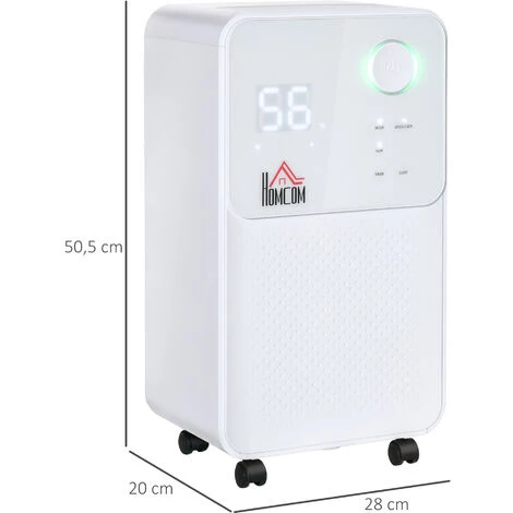 Ce déshumidificateur électrique est le meilleur choix à faire pour éliminer efficacement l’humidité et les moisissures dans une pièce. Cet équipement est conçu pour les endroits pas assez ventilés comme la salle de bain, la cuisine, le garage, etc. Discret, peu encombrant, d’une grande mobilité grâce à ses roulettes et à sa poignée, vous pouvez également l’installer dans votre chambre. Caractéristiques : – Ce déshumidificateur est efficace pour se débarrasser de l’humidité, des moisissures et des mauvaises odeurs contenues dans toutes les pièces de la maison : chambre à coucher, salle de bain, etc. – Appareil compact, facile à déplacer grâce à ses 4 roulettes pivotantes à 360° et à sa poignée intégrée – Grande efficacité, car il peut absorber jusquà 16L/24H (à 30°C, 80% d’humidité) avec un réservoir d’eau d’une capacité de 2L – Déshumidificateur idéal pour utilisation dans une pièce de 16 m² max. – Panneau de contrôle très intuitif avec affichage LED – Nombreuses fonctions : verrouillage, timer 24H max., 2 vitesses, 4 modes (ensoleillé, pluvieux, séchage, nuit) – Ce déshumidificateur s’arrête automatiquement quand le réservoir d’eau est plein : sécurité optimale d’utilisation – Appareil silencieux ne perturbant pas le sommeil la nuit (emission sonore inférieure à 38 dB) – Certifié normes CE-EMC, RoHS, LVD et ERP Spécifications : – Couleur : blanc – Matériau : ABS – Dim. totales : 28L x 20l x 50,5H cm – Fonction de déshumidification : 16L (par jour) – Volume du réservoir d’eau : 2 L – Longueur câble d’alimentation : 1,5 m – Capacité de couverture : 12-16 m² max. – Tension nominale : 220-240 V/50 Hz – Puissance : 270 W – Livraison effectuée en un colis – Réf. : 821-018V91