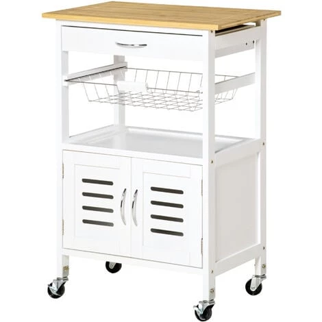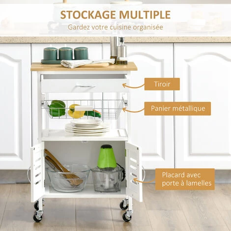 Cette desserte à roulettes est compacte et idéale pour les petits espaces nécessitant un peu plus de rangement. Le chariot de cuisine HOMCOM dispose d’un tiroir, d’un panier en métal amovible et d’une petite armoire pour offrir suffisamment d’espace pour vos ustensiles et accessoires de cuisine. Il est équipé de 4 roues pour un déplacement facile. Son design bicolore, blanc et bois naturel, en fait un chariot très polyvalent qui s’adapte à la plupart des styles de mobilier et de décoration.