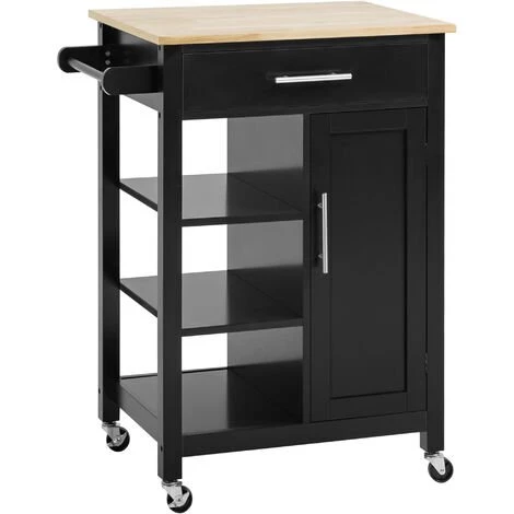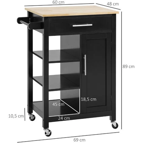 Cette jolie desserte de cuisine bicolore noir bois d’hĂ©vĂ©a s’intĂ©grera facilement dans votre intĂ©rieur. Ses nombreux rangements (grand tiroir, placard avec Ă©tagĂšre, 3 Ă©tagĂšres, poignĂ©e porte-torchon) vous permettront de rĂ©-organiser votre cuisine.