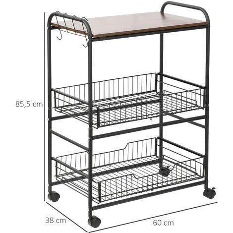 – Equipée de 2 paniers coulissants en métal noir et d’un plateau en panneaux de particules aspect bois