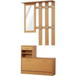 Ce superbe ensemble de meubles d’entrée design contemporain illuminera votre intérieur ! Doté d’un meuble à chaussures multi-rangements et d’un panneau porte-manteau avec miroir intégré, vous pourrez ranger et ordonner toutes vos affaires comme bon vous semble. Caractéristiques : – Ensemble de meubles d’entrée composé de 3 pièces : meuble à chaussures, panneau porte-manteau et miroir – 6 patères design double tige métal afin de vous permettre de bien accrocher vos manteaux, vestes, écharpes et autres accessoires – Meuble à chaussures multi rangements : double niveau rangement chaussures, 2 niches, tiroir coulissant et 2 plateaux – Meuble à chaussures avec porte abattante et séparateur de niveaux réglable à 2 positions – 3 poignées en métal en harmonie avec les patères pour plus d’élégance – Manuel d’instructions et d’assemblage illustré – Note : décorations non fournies Spécifications : – Couleur principale : aspect bois clair – Dimensions panneau porte-manteau : 90L x 24l x 116H cm – Dimensions meuble à chaussures : 90L x 24l x 75H cm – Dimensions tiroir coulissant : 26L x 18l x 7H cm – Dimensions miroir : 25L x 70H cm – Dimensions rangement interne meuble à chaussures : 81L x 23l cm – Matériaux principaux : panneaux de particules, métal – Charges max. recommandées : 10 Kg (porte-manteau)/30 Kg (meuble à chaussures) – Réf : 831-146BN