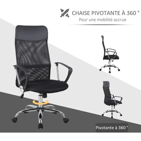 Ce splendide fauteuil de bureau ergonomique s’intégrera parfaitement dans votre chambre ou bureau. Doté d’un généreux rembourrage en mousse ainsi que d’un revêtement en maille et revêtement synthétique plus respirant et confortable, vous pourrez passer de longues heures assis sans vous soucier de votre confort d’assise. Caractéristiques : – Design contemporain mélant des matériaux de qualité (tissu maille, revêtement synthétique et métal chromé) : touche d’élégance supplémentaire dans votre bureau garantie – Fauteuil manager grand confort : dossier ergonomique à bascule verrouillable, idéal pour se détendre si besoin – Position optimale de travail : hauteur d’assise réglable de 50 à 59,5 cm (système de vérin à gaz) – Déplacement et mouvement facile et pratique : 5 roulettes pivotantes à 360° – Revêtement en tissu maille et revêtement synthétique afin de vous offrir une assise aérée par toute température – Assise disposant d’un garnissage mousse haute densité épais pour un confort d’assise inégalable – Montage simple à l’aide de la notice d’assemblage illustrée Spécifications : – Couleur : noir – Matériaux principaux : tissu en maille, PVC, rembourrage mousse, coton, nylon – Dim. totales : 63l x 65P x 109-119H cm – Hauteur réglable assise : 50-59,5 cm – Charge max. recommandée : 120 Kg – Livraison effectuée en 1 colis – Réf. : A2-0093