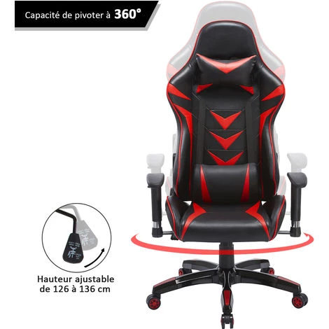 Description : Ce magnifique fauteuil de bureau gamer style baquet Racing ajoutera une touche d’originalité et de modernité à votre bureau. Sa conception et fabrication ergonomique associée à une assise et dossier profilé orange et noir forment un ensemble harmonieux qui sublimera votre bureau. Sans oublier son grand confort grâce à ses coussins têtière et lombaire fournis et maintenus grâce à un système de double lanière. Caracteristiques : – Fauteuil gamer style baquet racing très tendance – Inclinaison du dossier réglable jusqu’à 180° afin de vous permettre de vous allonger si besoin – Dossier à bascule d’une épaisseur de 18 cm idéale si vous restez assis de longues heures au travail – Revêtement en revêtement synthétique très confortable et facile d’entretien – Réglable en hauteur afin d’obtenir une position idéale de travail – Accoudoirs réglables horizontalement et verticalement – Coussins têtière et lombaire amovible fournis – Fauteuil pivotant à 360° – Rembourrage assise et dossier en mousse haute densité pour votre plus grand confort – Pied en étoile 5 branches, 5 roulettes multidirectionnelles pivotantes à 360° Specifications : – 2 coloris au choix : gris, rouge – Matériaux principaux : revêtement synthétique, mousse de rembourrage, métal, plastique ABS et PP – Dimensions totales : 67L x 49l x 126-136H cm – Dimensions position allongée : 135L x 67l x 69-79H cm – Dimensions assise : 52L x 53l x 45-55H cm (épaissseur 15 cm) – Dimensions dossier : 55l x 85H cm (épaissseur 18 cm) – Inclinaison accoudoirs : 35° – Vérin à gaz certifié SGS BIFMA – Dimensions dossier : 55l x 85H cm – Charge max. recommandée : 120 Kg – Réf. : 921-095GY/RD