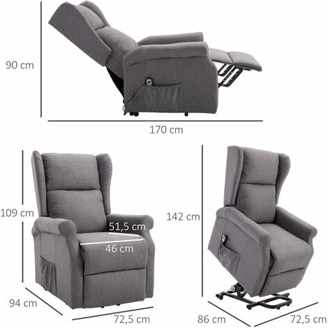 Ce fauteuil releveur de relaxation électrique vous offrira une expérience unique de détente et de bien-être confortablement installé. Vous pourrez incliner son dossier et relever son repose-pieds à votre guise sans effort par simple action de la télécommande ! Caractéristiques :- Fauteuil releveur de relaxation électrique- Fauteuil grand confort de style contemporain avec oreilles pour une parfaite intégration à votre intérieur- Équipé d’un dossier inclinable (jusqu’à 135°) et d’un repose-pieds relevable électriquement par télécommande- Fonction releveur assurée par un vérin hydraulique- Fauteuil idéal pour les personnes âgées ou les handicapés- Assise dotée d’un rembourrage mousse densité 29 Kg/m3- Grande fléxibilité et souplesse grâce au système de ressort sous-jacent- Accoudoirs, appui-tête et dossier ergonomique pour un confort d’installation optimal- Poche latérale de rangement pour votre télécommande, vos journaux ou autres- Revêtement en lin très perméable à l’air et donc très agréable au toucher par n’importe quelle condition : chaleur ou fraicheur- Certification norme CE Spécifications :- Couleur : gris chiné- Matériaux principaux : lin, mousse de rembourrage, bois, acier- Dim. totales : 72,5L x 94l x 109H cm- Dim. position inclinée : 72,5L x 170l x 90H cm- Dim. position relevé : 72,5L x 86l x 142H cm- Inclinaison maximale de 135°- Dim. assise : 46L x 51,5l x 50H cm- Dim dossier : 67l x 47H cm (épaisseur : 25 cm)- Longueur câble d’alimentation : 1,6 m- Charge max. recommandée : 200 Kg- Livraison effectuée en un colis- Réf. : 713-031GY