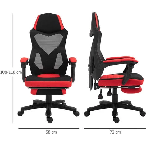 Ce fauteuil de bureau gaming est idéal pour travailler ou jouer dans le confort. Installez-vous dans ce fauteuil rembourré avec une mousse haute densité. Trouvez la position la mieux adaptée en ajustant la hauteur de l’assise (réglable de 42 à 52 cm). Sans oublier sa fonction inclinable, sa capacité à pivoter à 360° et son repose-pied rétractable intégré ! Caractéristiques : – Fauteuil de bureau gaming bicolore idéal pour apporter une touche d’élégance dans votre bureau, chambre, salon, etc. – Hauteur d’assise réglable de 42 cm à 52 cm (par action manette vérin hydraulique) afin d’obtenir une position idéale de travail – Fauteuil pivotant à 360°, piètement en étoile 5 branches motif relief fléché doté de 5 roulettes pivotantes également à 360° – Dossier inclinable jusqu’à 135°, idéal pour profiter d’un instant de repos – Repose-pied pliable et moelleux inclus – Assise, dossier et accoudoirs ergonomiques rembourrés de mousse haute densité afin d’encore plus optimiser votre confort d’utilisation – Revêtement tissu et maille : excellente ventilation et régulation par toute température – Montage facile, rapide à l’aide du manuel d’assemblage illustré fourni Spécifications : – 2 coloris au choix : rouge, noir ou gris, noir – Matériaux : tissu, maille, polypropylène, nylon – Dim. totales : 58l x 72P x 108-118H cm – Dim. inclinée (sans repose-pieds) : 58l x 91P x 97-107H cm – Dim. assise : 49l x 49P x 42-52H cm – Dim. dossier : 46l x 69H cm – Charge max. recommandée : 120 Kg – Système vérin à gaz TUV – Certification norme EN1335 – Livraison effectuée en un colis – Réf. : 921-233/233V80GY