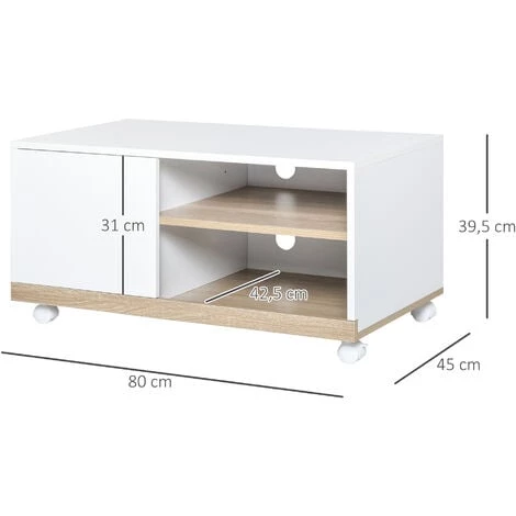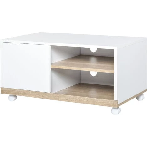 Ce joli meuble TV compact et moderne bicolore blanc chêne clair s’intégrera parfaitement à votre intérieur. Idéal pour installation dans votre salon, chambre ou salle de jeu, ce meuble TV sur roulettes (dont 2 équipées de frein) vous permettra de ranger votre équipement vidéo et audio tout en ayant la possibilité de le déplacer et de l’orienter à votre guise ! N’hésitez plus et optez pour ce meuble à la fois design et fonctionnel.