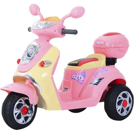 Description : Cette splendide moto scooter électrique pour enfants de 3 ans va procurer beaucoup de plaisir à votre bambin ! Équipée de 3 roues, de rétroviseurs, d’un topcase, etc… et dotée d’effets lumineux et sonores, votre enfant pourra découvrir en toute sécurité les joies du motard Caractéristiques : – 3 roues pour plus de stabilité et sécurité même pour les néophytes – Développe la capacité d’apprentissage de votre enfant aux joies de la conduite en moto – Effets lumineux (phares) et sonore (sortie branchement MP3) – Durée de charge complète de 8 à 12 H – Durée d’utilisation complète (utilisation continue) après une charge complète est de 45 min. environ – Charge max. recommandée de 25 Kg – Marche avant et arrière pour un déplacement en toute commodité via pédale d’accélerateur – Nombreux accessoires comme les vrais motos : rétroviseurs, topcase, etc… – Certifications normes CE, EN71-1/-2/-3, EMC et EN62115 – Avertissement : utilisation uniquement sous la surveillance d’un adulte hors de la voie publique ne convient pas aux enfants de moins de 36 mois Spécifications : – Coloris disponibles : rose ou bleu – Dimensions : 108 L x 51 I x 75 H cm – Dimensions selle : 18L x 23l x 8H cm – Diamètre roues : 22 cm – Matériaux principaux : métal et plastique PP – Vitesse d’environ 3 Km/h – Temps de charge : de 8 à 12 H maximum (4 à 6 H max. la première fois) – Durée d’utilisation complète après charge : 45 min. environ – Batterie : 6 V 4 AH – Age adéquate : 3 ans – Charge max. recommandée : 25 Kg – Réf. : 370-013A/034