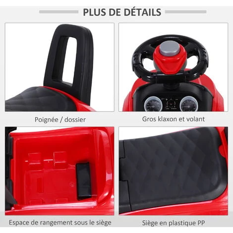 Grâce à ses nombreuses fonctionnalités, cette superbe voiture porteur pour enfant procurera des heures d’amusement ! Ce jouet est équipé d’un coffre et d’un klaxon, pour amuser encore plus les enfants durant leur conduite. Les 4 roues larges associées à 2 butées anti-bascule assureront une parfaite stabilité pour faciliter l’apprentissage de la marche et le développement de la motricité.