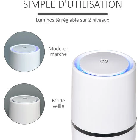 Améliorez la qualité de l’air de votre intérieur avec ce purificateur d’air portable HOMCOM. Utilisant la technologie de filtrage HEPA, il garantit une efficacité élevée pendant le processus de filtration de l’air. Compact et léger, il peut être transporté facilement d’une pièce à l’autre. Il deviendra vite indispensable ! Caractéristiques : – Le filtre HEPA garantit une efficacité de filtration de l’air – Grâce à la diffusion d’ions négatifs, les particules fines sont éliminées de votre pièce – Purificateur d’air portable est léger et compact, parfait pour une utilisation dans le salon, la chambre, le bureau, la salle de bain, la voiture, etc – Couvre une surface de 10 m³ – Facile d’utilisation avec un seul bouton pour activer les 2 modes d’utilisation et les lumières : mode veille (lumière rouge) / mode en marche (lumière bleue) – La luminosité est réglable sur 2 niveaux d’intensité – Fonctionnement silencieux (?32dB), idéal pour un usage même pendant la nuit ou en lieu calme type spa, institut de beauté, institut de massage, etc… – Taille compacte, source d’alimentation par prise USB (câble USB inclus) : usage pratique, facile avec possibilité de l’emmener en vacances Spécifications : – Couleur principale : blanc – Matériaux principaux : ABS, PP – Dim. totales : Ø 12,5 x 19,5H cm – Capacité de couverture : 10 m³ – Débit d’air : 16 m³/h – Efficacité de purification (CADR) : 10m³/h – Densité d’ions négatifs : 7 millions – Température d’ambiance applicable : -10 ?-45 ? – Bruit pendant fonctionnement : 32dB – Puissance : 2 W – Tension d’entrée : DC 5 V – Longueur câble USB : 1 m – Certifications normes EMC, RoHS – Réf : 823-014