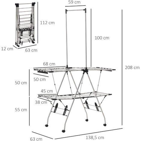 – Etendoir portant pliable compact afin de vous en faciliter son rangement et déplacement si besoin (4 roulettes dont 2 avec frein)