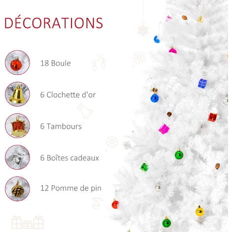 Ce superbe sapin blanc de Noël d’une hauteur de 180 cm vous aidera à créer une atmosphère féerique ! Sa décoration, fournie avec le sapin, se compose d’éléments variés et colorés : boules, cloches, mini tambours, mini cadeaux ou encore de magnifiques pommes de pin. En un clin d’œil, vous aurez installé ce superbe sapin blanc qui ravira petits et grands !