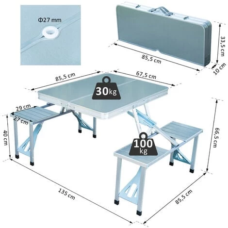 Cette table de pique- nique pliante avec 4 places est idéale pour le camping ou les excursions dans les forêts ou en bord de mer. Elle est légère (en aluminium) et très pratique. Une fois pliée, cette table peut être transportée comme une valise!