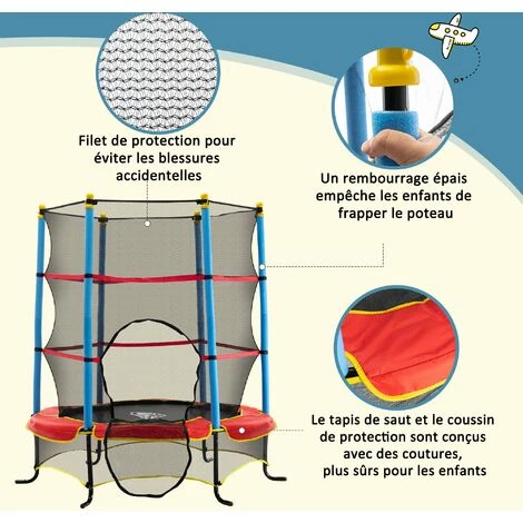 Ce magnifique trampoline de jardin pour enfants avec filet de sécurité permettra à vos enfants de 3 jusqu’à 6 ans de s’amuser et de se défouler sans aucun danger. Les sauts de trampoline sont bénéfiques et permettent d’entraîner endurance, coordination, équilibre et agilité !