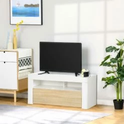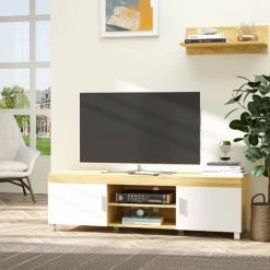 HOMCOM Meuble TV Banc TV Sur Pieds 2 Placards 2 Niches 2 Passe-fils MDF Aspect Chêne Clair Blanc